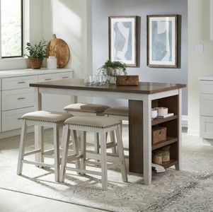 Perfect for small space dining or home office area. Brook Creek offers multiple finish options. A casual styling that fits into any decor. Features bookcase table with two fixed shelves for more storage, tapered legs, and four padded counter height stools with accent nail heads. All packaged in one box.Read More