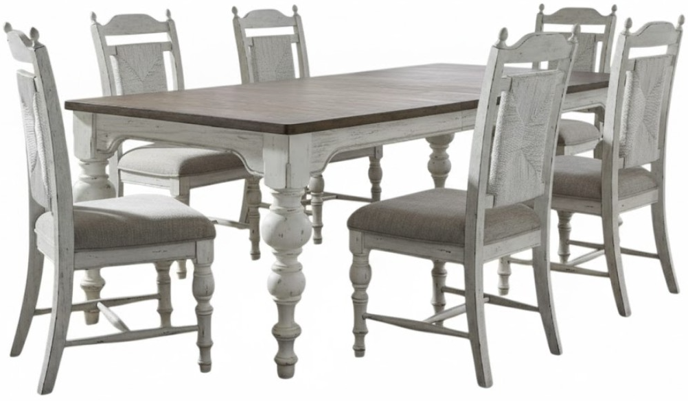 Designed to entice a sense of calm and tranquility into interior spaces, the River Place table set strikes the perfect balance of life on the coast and a comfy home tucked away in the hills. This set features a heavily distressed riverstone white and tobacco finish and includes table and six panel back side chairs.Read More