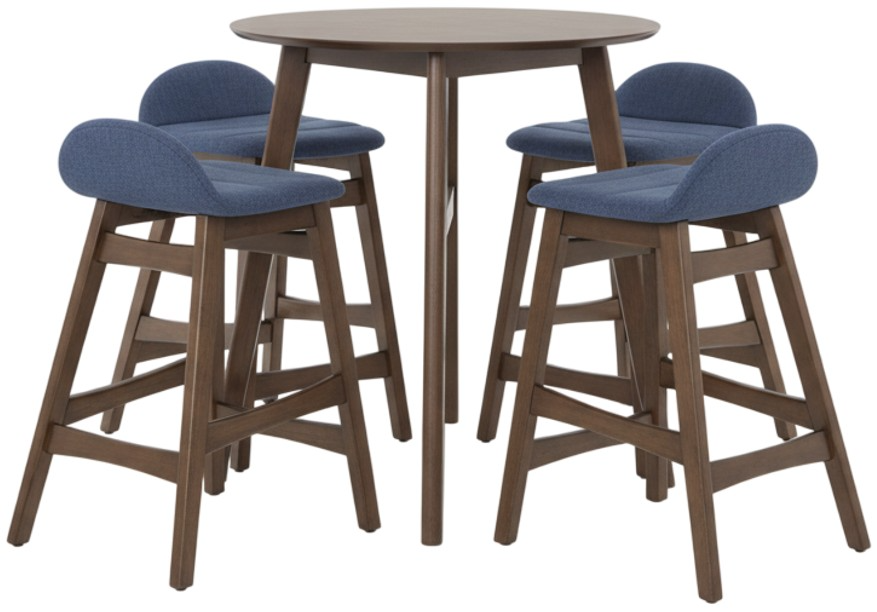 Do not sacrifice style while saving space with the Space Savers five-piece gathering table set. Crafted of rubberwood solids and walnut veneers, this set features a satin walnut finish and consists of the gathering table and four counter height chairs with blue jean denim upholstery.Read More
