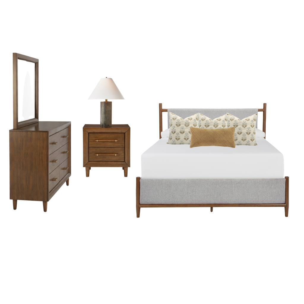 Includes upholstered panel headboard and footboard + dresser and mirror + nightstand