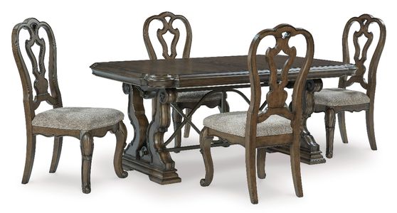 Signature Design by Ashley® Maylee Dark Brown Dining Table Set.From its ornamental appliques to its large scale, this dining extension table makes a bold statement. With a shapely tabletop that sits upon a double pedestal base, the opulent piece wows with stunning style. The look is timeless. The feel? Right at home.Read More