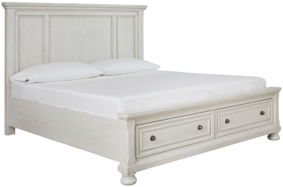 Elegant, timeless furnishings take your bedroom to the next level. Nothing does that better than this king panel storage bed. The antiqued white finish with a wonderful grain texture radiates sophistication, while the dark bronze-tone hardware adds an ornate touch to the handy storage drawers.Read More
