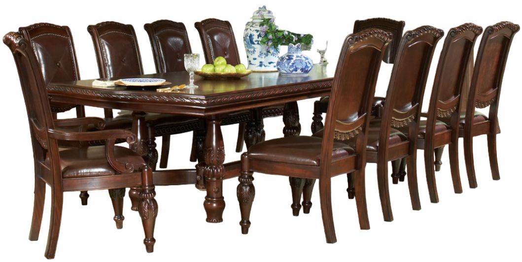 Set includes the antoinette 96-120-inch dining table with 24-inch leaf and 2 antoinette arm chairs and 8 antoinette side chairs