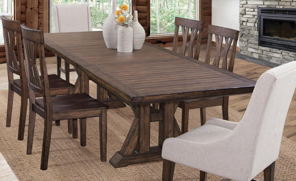 The Auburn 5-piece dining set brings elegance and comfort to your dining area. At its heart is the auburn expandable table a masterpiece in large area dining. With its dark tobacco finish and burnished edges.Read More