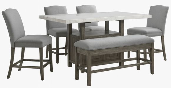 Refined rustic styling brings an elegant casual feel to dining in the Grayson Counter Dining Set. A beautiful white marble top pairs beautifully with a Driftwood finish and ash-gray fabric on Counter Chairs and Bench. The Bench and Table offer valuable storage for placemats, silverware or other items.Read More