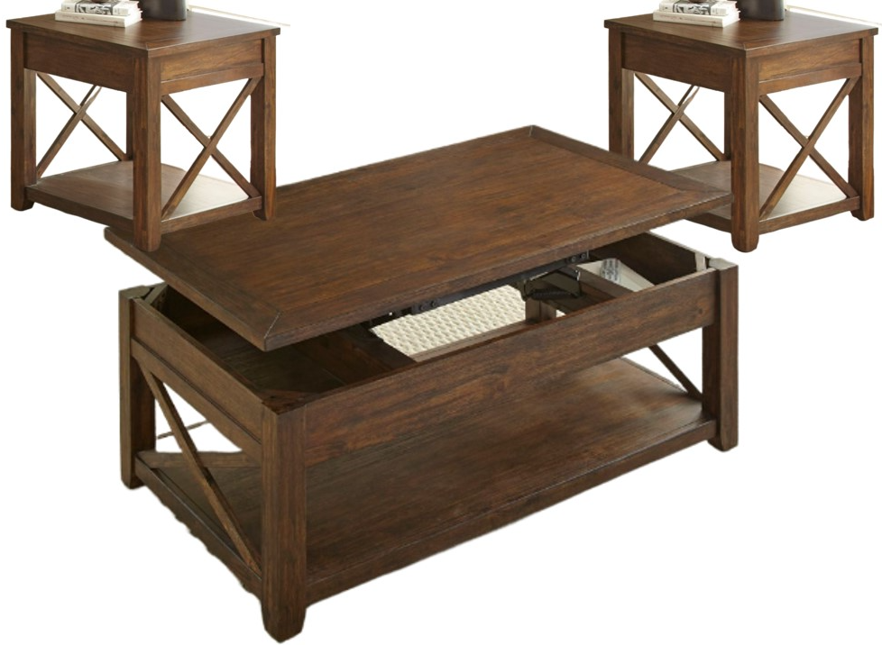 Now you can get updated rustic styling with the Lenka Lift-Top occasional set. A rich mocha finish invites you to use the wonderful functionality built into the Lift-Top Cocktail Table. Work or dine from the comfort of your sofa as you enjoy the distressed finish and cross-style end panels.Read More