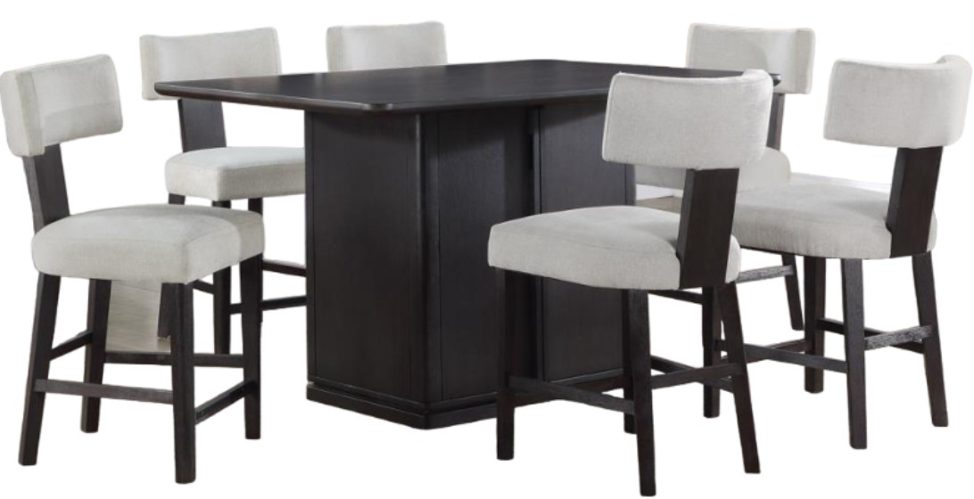 The Steve Silver Co. Oakley 7-Piece Black Counter Height Dining Set includes a dining table and six matching chairs, all in a rich brown finish. This set provides ample seating, making it ideal for family meals or gatherings, and adds a practical, stylish touch to any dining space.Read More