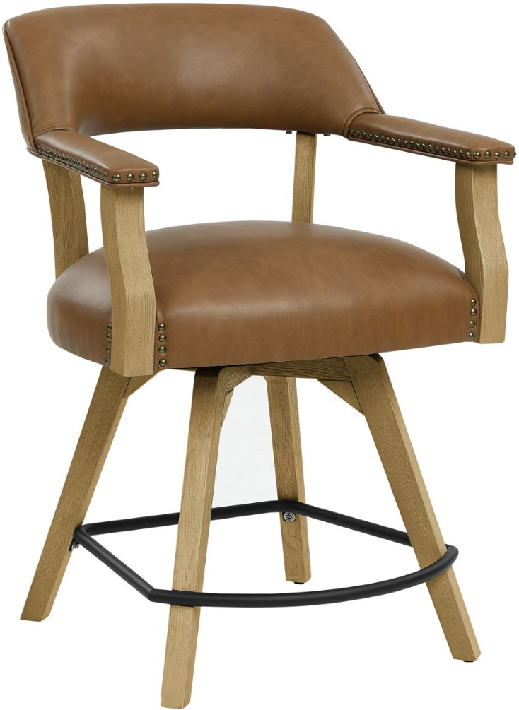 The camel vegan leather counter chair, accented with copper nailhead trim, offers a sophisticated look with the soft touch and durability of leather, yet is easy to maintain and resistant to wear and tear